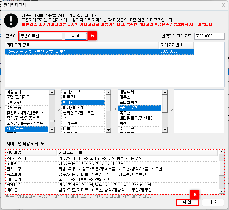 ③ 검색란에 원하는 카테고리 명을 입력 후 [검색] - 하단에 노출되는 카테고리 경로 선택 - [확인] 선택합니다.