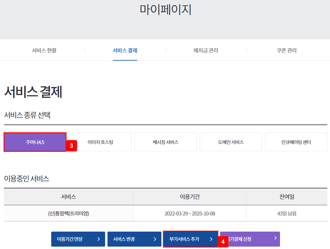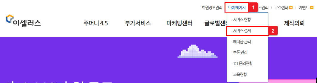 2. [마이페이지] > [서비스 결제] 선택합니다.