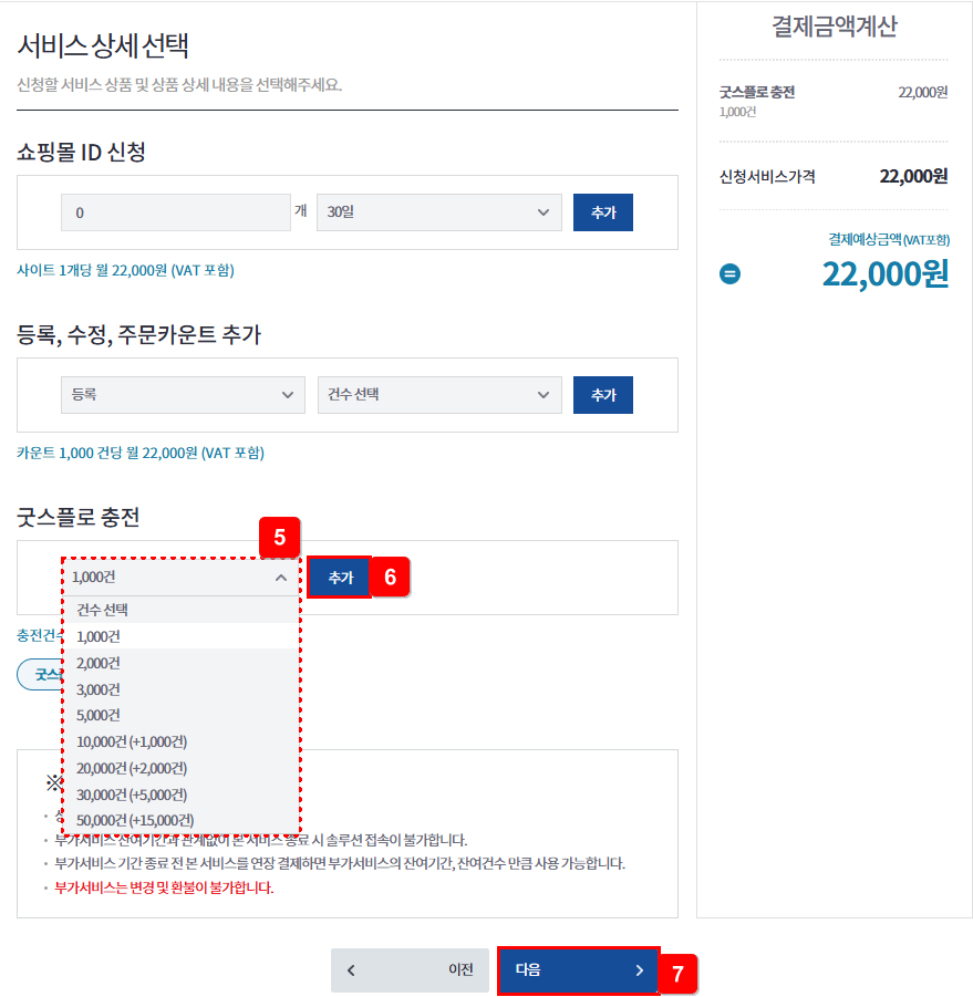4. 부가서비스 항목 중 [굿스플로 충전] 건수 선택 및 [추가] 선택 후 [다음] 선택합니다.