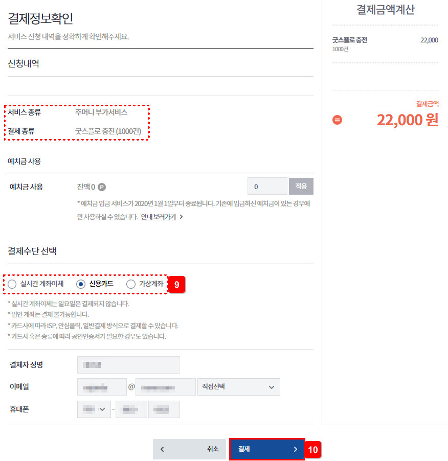 6. 신청내역 확인 및 결제수단 선택하여 [결제] 선택합니다.