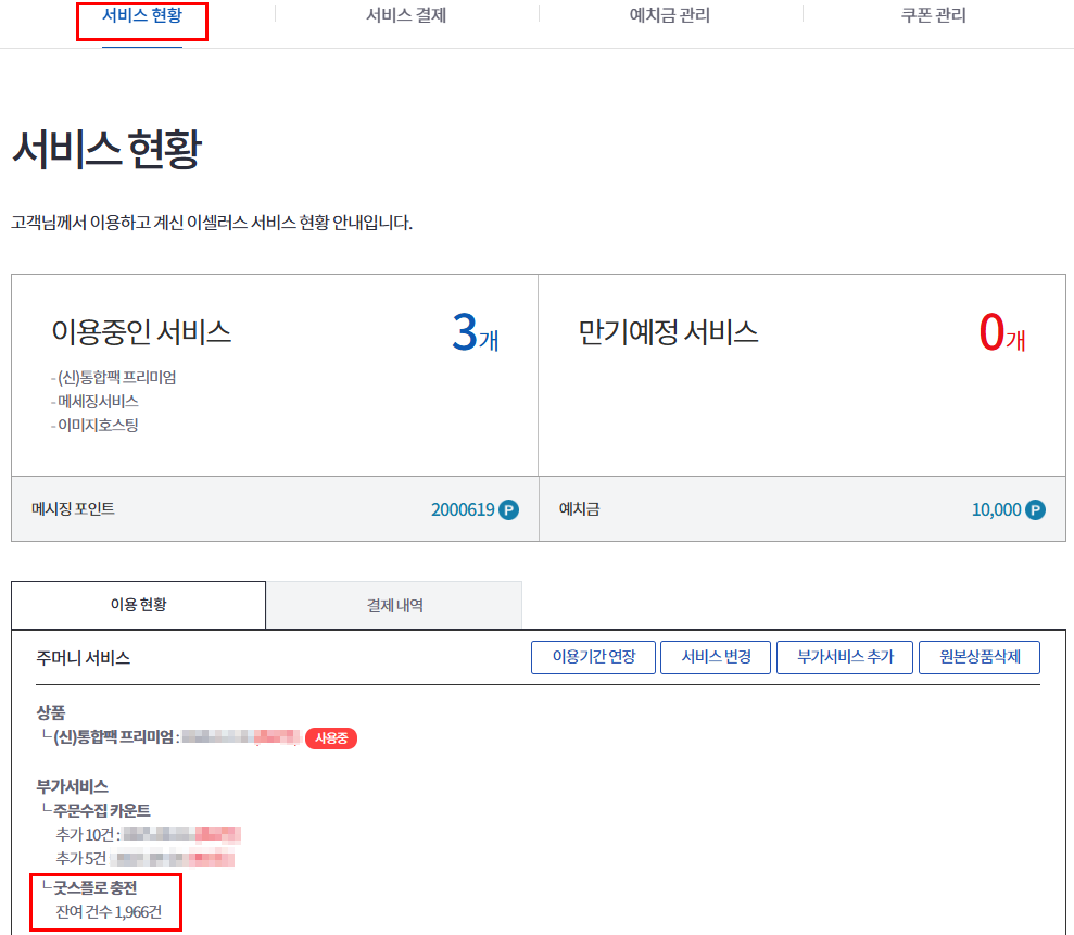 - 굿스플로 부가서비스 결제는 이셀러스 홈페이지 로그인 후 아래 경로에서 진행 가능합니다.