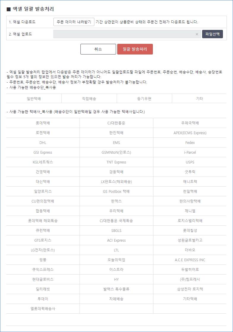 2) 사용 가능한 배송수단과 배송사명은 엑셀 일괄 발송처리 팝업에서 확인 가능하며 복사하여 엑셀에 붙여넣기로 사용이 가능합니다.