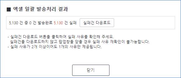 4) 실패 건이 존재할 경우, 실패 건을 다운로드하지 않고 팝업창을 닫는 경우 실패 사유 재확인이 불가능하니 실패 건이 존재하는 경우 반드시 엑셀을 다운받아 실패 사유를 확인하여 재발송처리해 주세요.