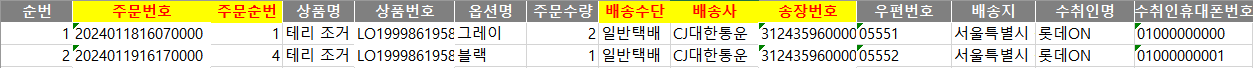 1) 일괄발송처리할 엑셀 파일에 주문번호, 주문순번, 배송수단, 배송사, 운송장 번호 5개 항목에 대한 정보가 없거나 부정확할 경우 발송처리가 불가능하니 정확한 데이터를 입력해 주세요.