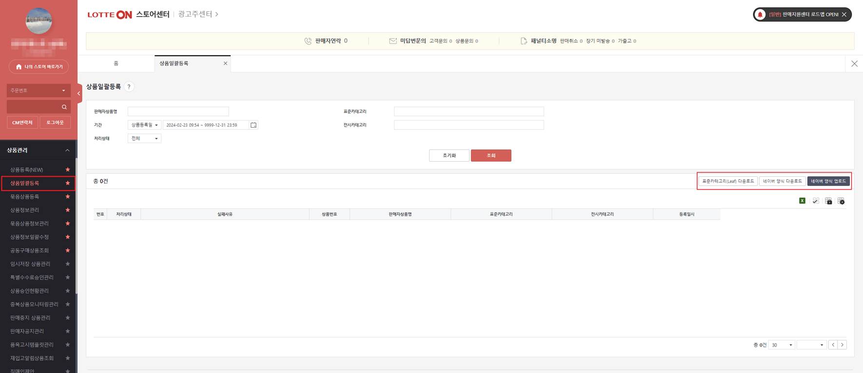 ■ 메뉴 경로: 스토어센터 > [상품관리] > [상품일괄등록]