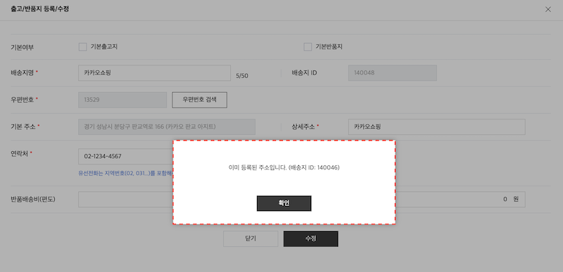 - 중복등록방지 정책으로 인한 주소록 등록이 실패된 경우 아래와 같이 배송지ID와 함께 안내 메시지가 얼럿됩니다. 메시지의 배송지ID를 참고하시어 상품등록 시 기존 등록된 주소록을 사용해주시기 바랍니다.