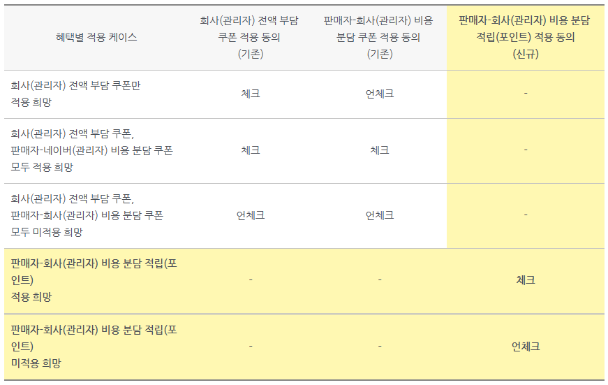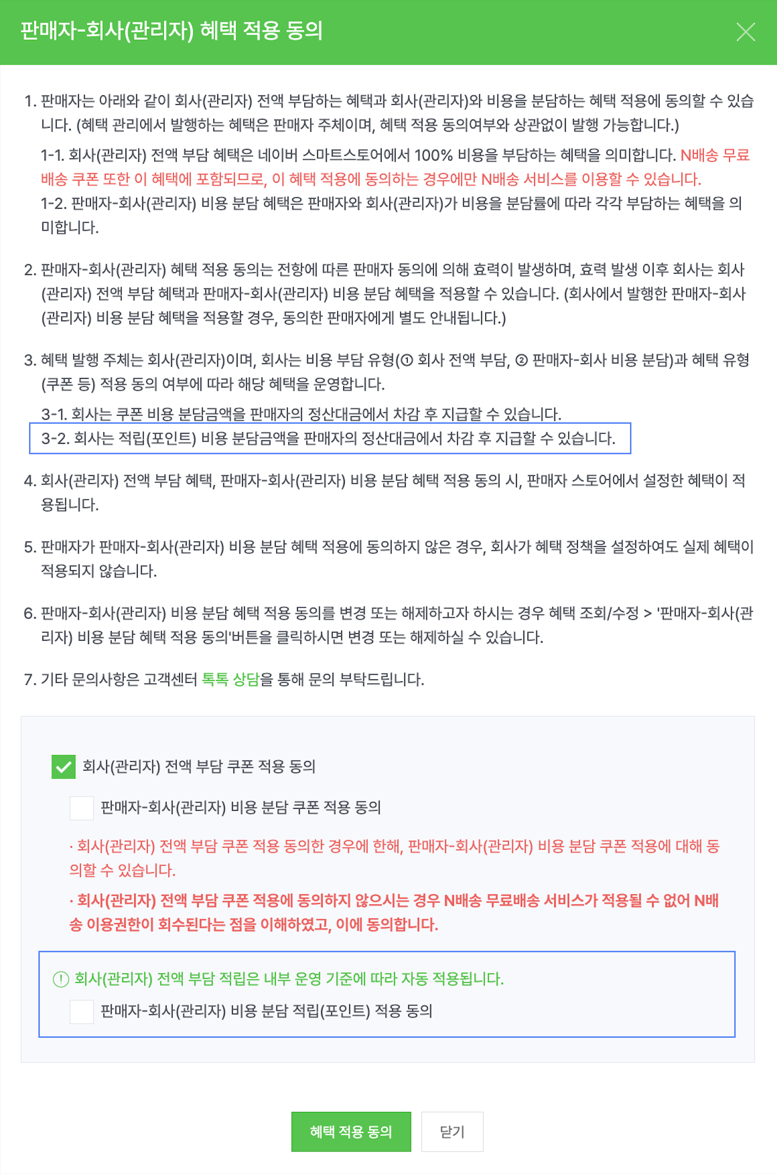 판매자-회사(관리자) 비용 분담 - 적립(포인트) 적용 동의 항목이 추가되어, 네이버에서 발행하는 적립 적용에 대해 판매자 의사에 따라 동의여부를 설정할 수 있습니다.
