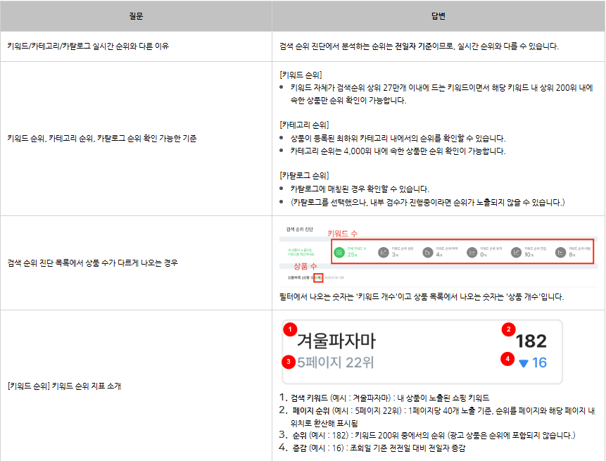 판매중인 상품을 기준으로 전일자 카테고리 순위, 키워드 순위를 확인할 수 있는 검색 순위 진단
