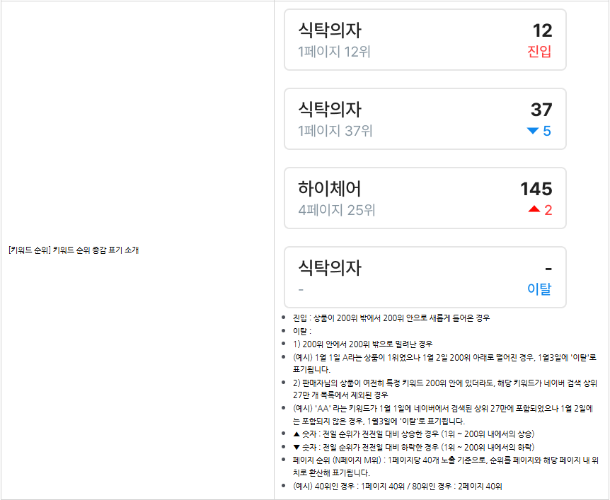 판매자님의 상품이 네이버 쇼핑에서 몇 위인지 매일 확인할 수 있으며, 전일 대비 순위 증감도 함께 확인하실 수 있는 서비스입니다.