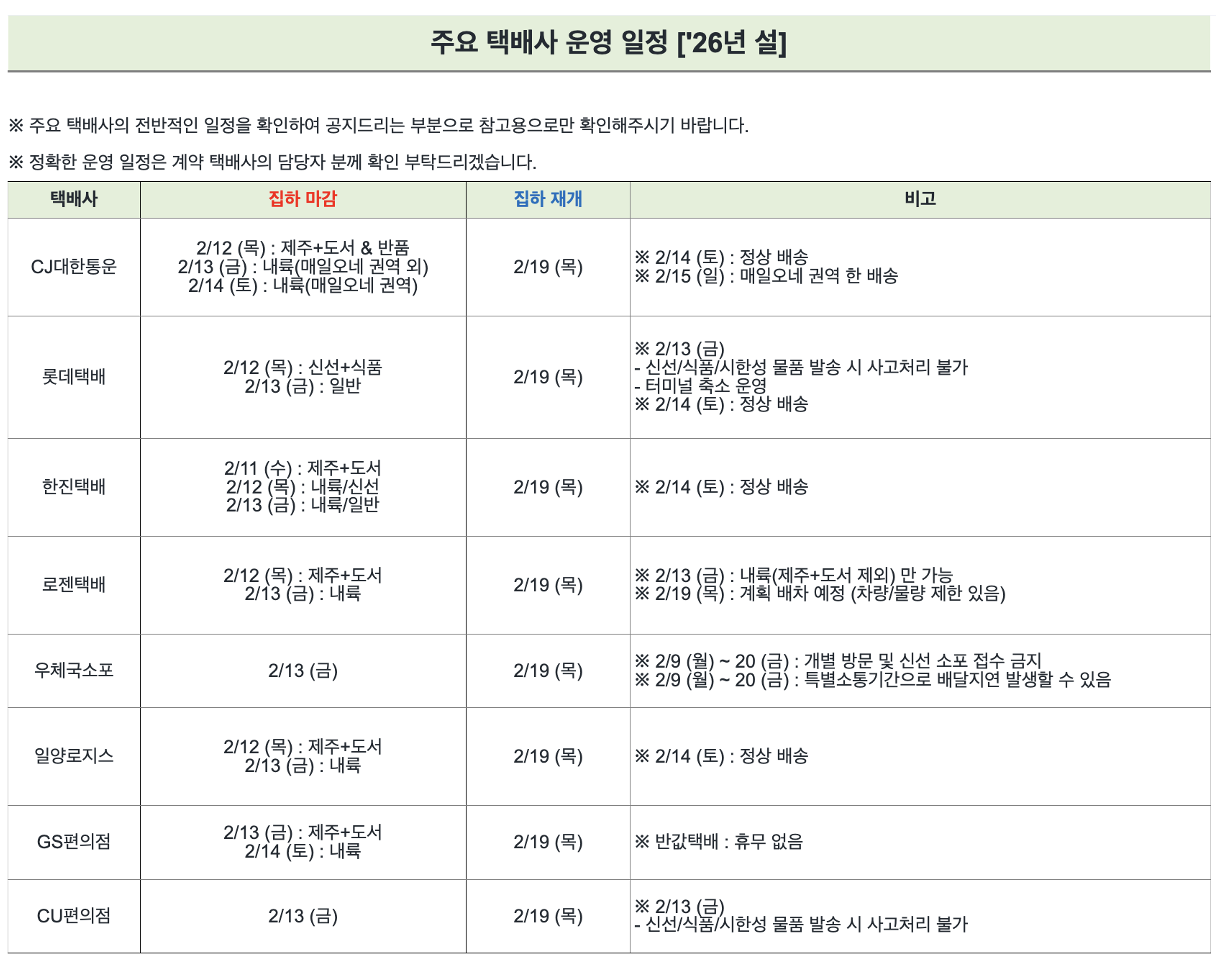 2026년 설 특수기 주요 택배사 운영 일정 공유 드립니다.