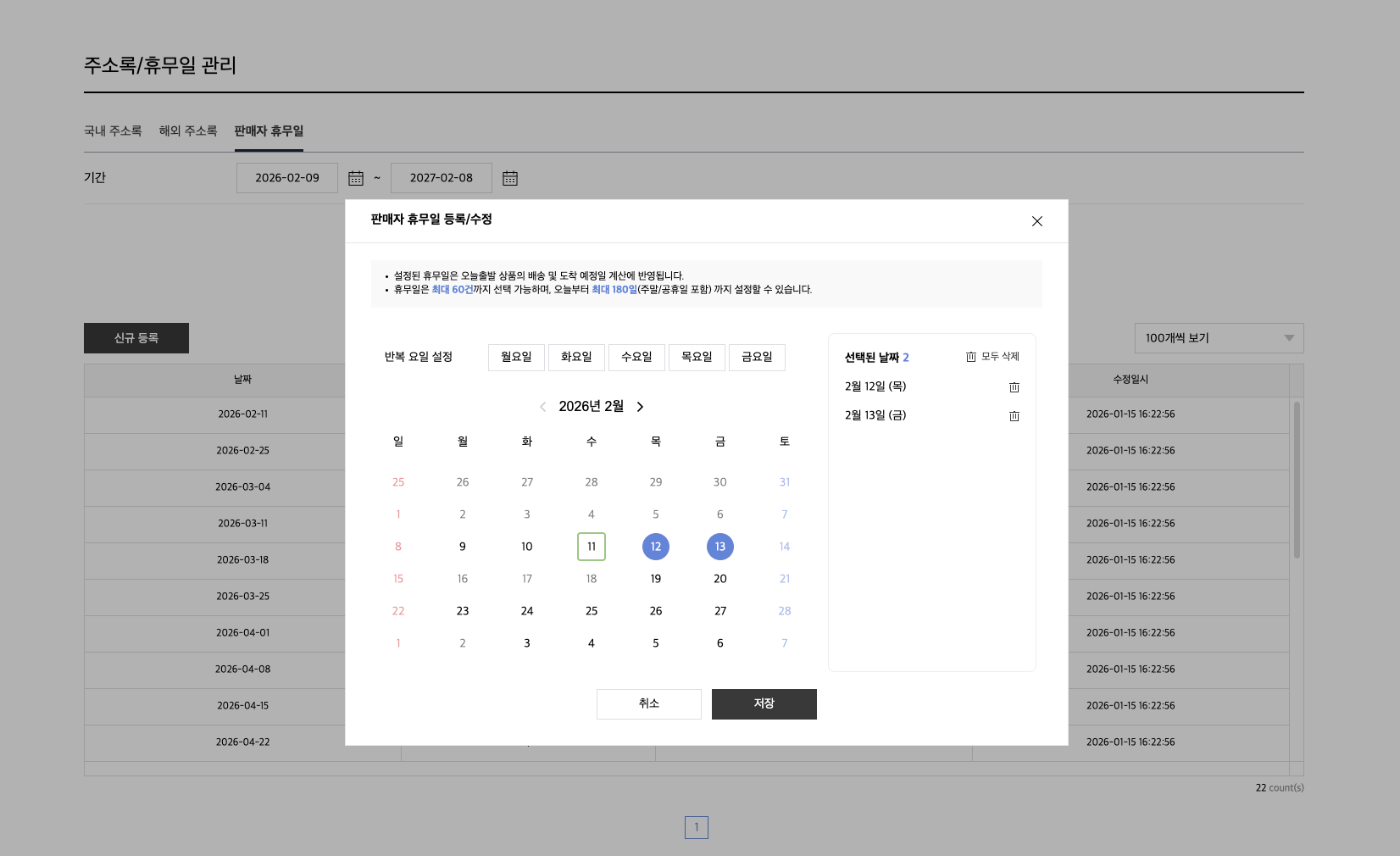 ▪︎ 경로: 판매자센터 > 판매자정보 > 주소록/휴무일 관리 > 판매자 휴무일 탭