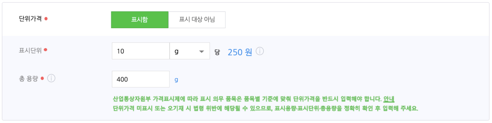 정확한 단위가격 표시를 위해 실제 상품의 표시용량, 표시단위, 총 용량을 정확히 입력해주세요.