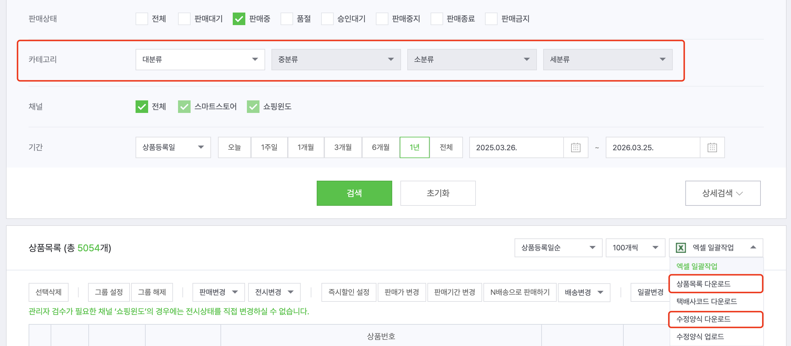 상품관리 > 상품 조회/수정 메뉴에서 검색 조건을 설정하여 검색하거나, 엑셀을 다운로드하여 확인할 수 있습니다.