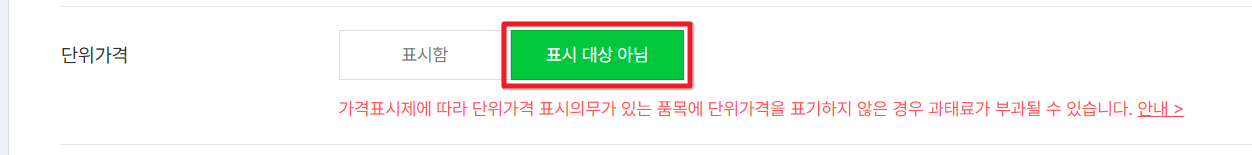 산업통상부를 통해 단위가격 표기가 불필요한 것으로 확인된 경우, 스마트스토어의 단위가격 항목을 "표시 대상 아님"으로 선택해주시면 됩니다.