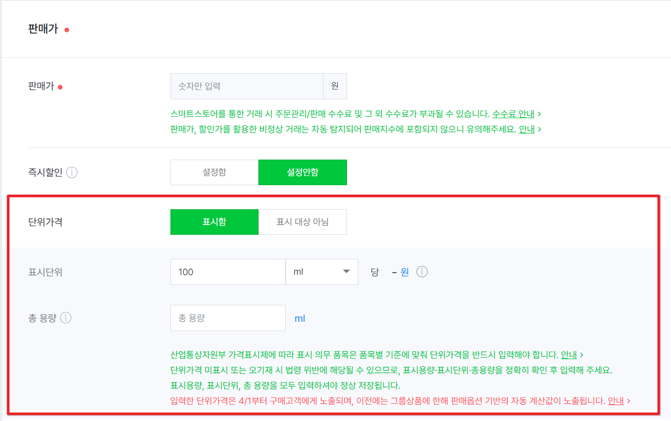 입력된 단위가격 정보는 4/1부터 구매고객에게 안내됩니다. 공지사항 바로가기 >