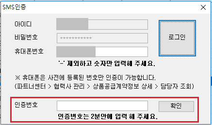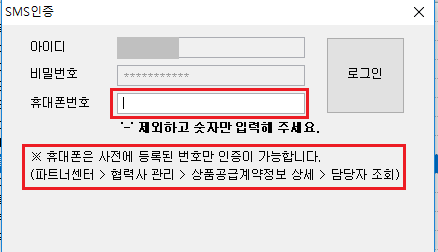 *휴대폰 번호는 [파트너센터>협력사 관리>상품공급계약정보 상세>담당자 조회]에서 등록된 번호만 인증이 가능합니다.