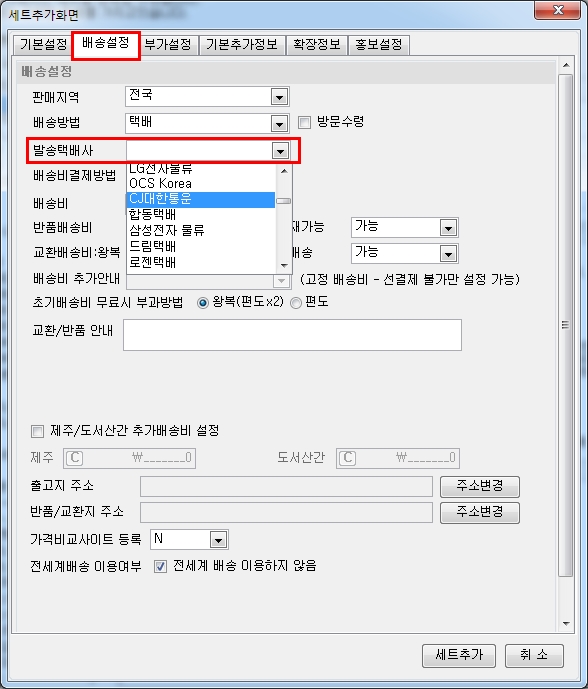 1. 원본상품>세트관리>11번가 세트>배송설정>발송택배사 선택