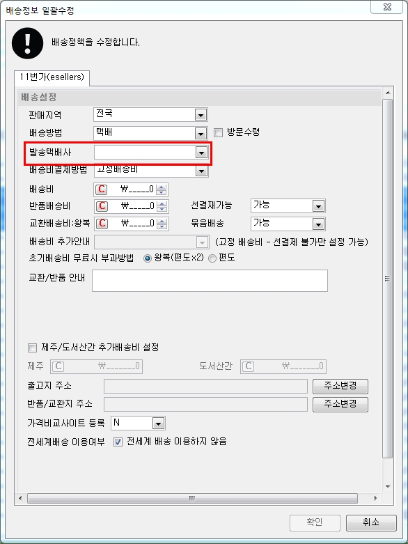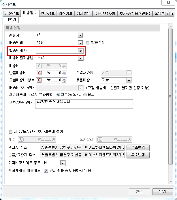 상품관리에서 11번가 상품 등록/수정 시 발송택배사값을 설정해 주셔야지만 작업이 가능하며, 설정 방법은 다음과 같습니다.