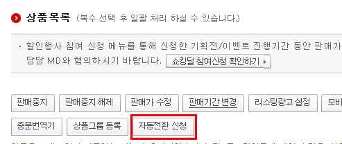 •단일상품 자동전환 신청 방법 : 셀러오피스>상품관리>상품 조회/수정>'자동전환 신청'>'확인'