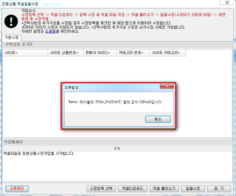 ►오류 메시지 : 'Items' 테이블의 'ITEM_ENDDATE' 열의 값이 DBNull입니다.