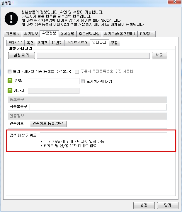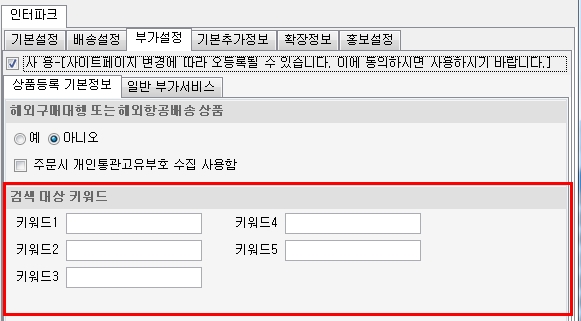 상품관리에서 [인터파크 검색 대상 키워드] 입력을 [인터파크 세트]>[부가서비스] 메뉴에서 제공해드렸습니다.