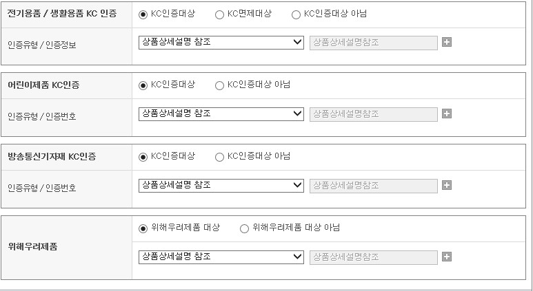 2. 원본상품에서 인증정보를 [상세설명참조]로 선택 시 설정하신 카테고리에서 등록 가능한 모든 인증정보에 [상품상세설명 참조]로 등록됩니다.