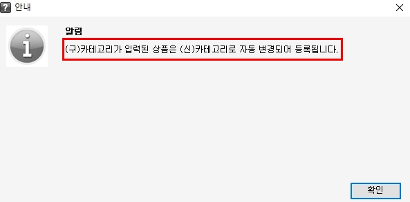 →단, (구)표준카테고리로 작업 시도 시 아래와 같은 안내 팝업창이 뜨며,