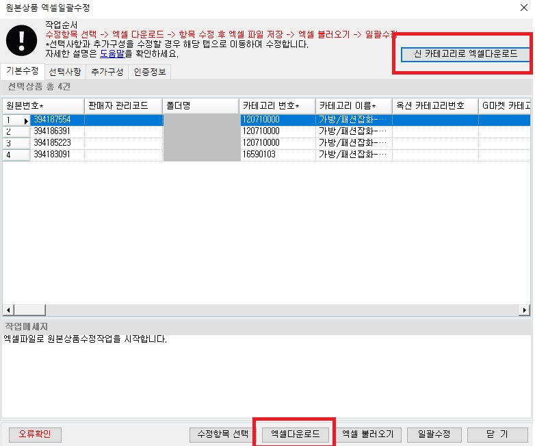 - (신)표준카테고리 번호는 원본상품>정보추가>원본상품 엑셀추가 메뉴에서
