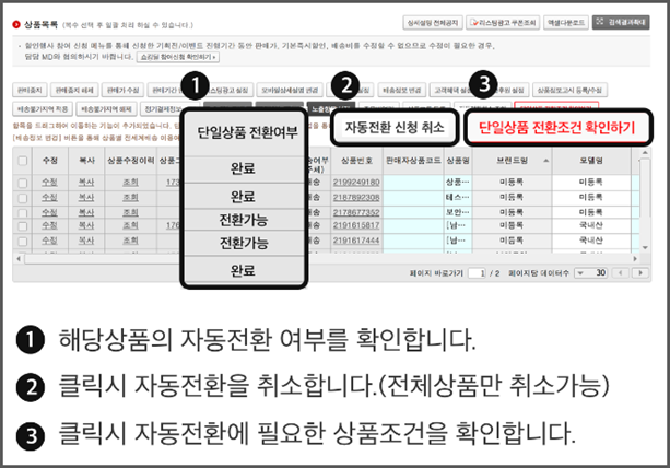 - 전환가능 : 단일상품 자동전환 예정 (자동전환을 동의하지 않는 판매자는 자동전환 신청취소 클릭)