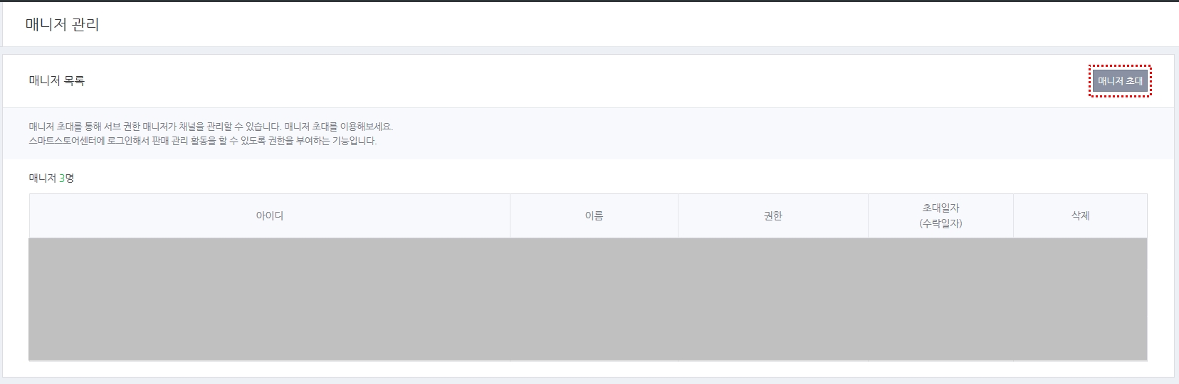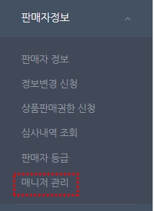 2. 왼쪽 메뉴 중 [판매자정보]>[매니저 관리] 메뉴를 클릭합니다.
