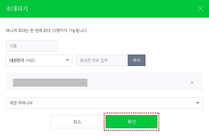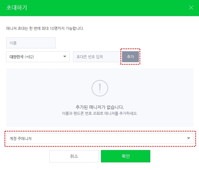 4. 하단 항목에서 [계정 주머니저]로 변경 후 이름,휴대폰번호를 입력한 다음 [추가]를 클릭합니다.