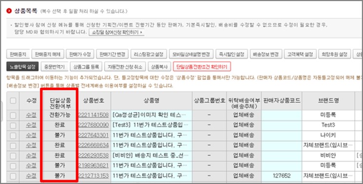 확인경로 : 셀러오피스 ▶ 상품관리 ▶ 상품조회/수정 ▶ 상품목록 ▶ 단일상품 전환여부 ▶ 상태값이 ‘완료’로 변경되었는지 확인
