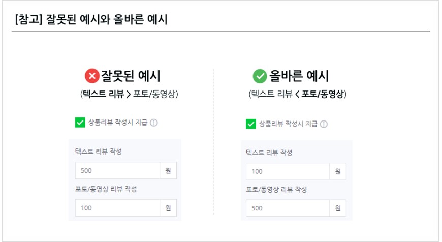 텍스트 리뷰 포인트 보다 포토/동영상 리뷰 포인트를 낮게 설정하고 계십니다.