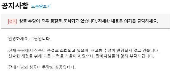 현재 쿠팡 판매 페이지에서 상품이 품절로 조회되는 장애로 인하여 쿠팡API 사용이 일시적으로 제한되었습니다.