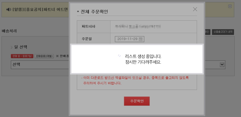 현재 위메프1.0 사이트에서 주문건 엑셀 다운로드 실패로 인해 주문 수집 작업이 실패되고 있어 안내 드립니다.