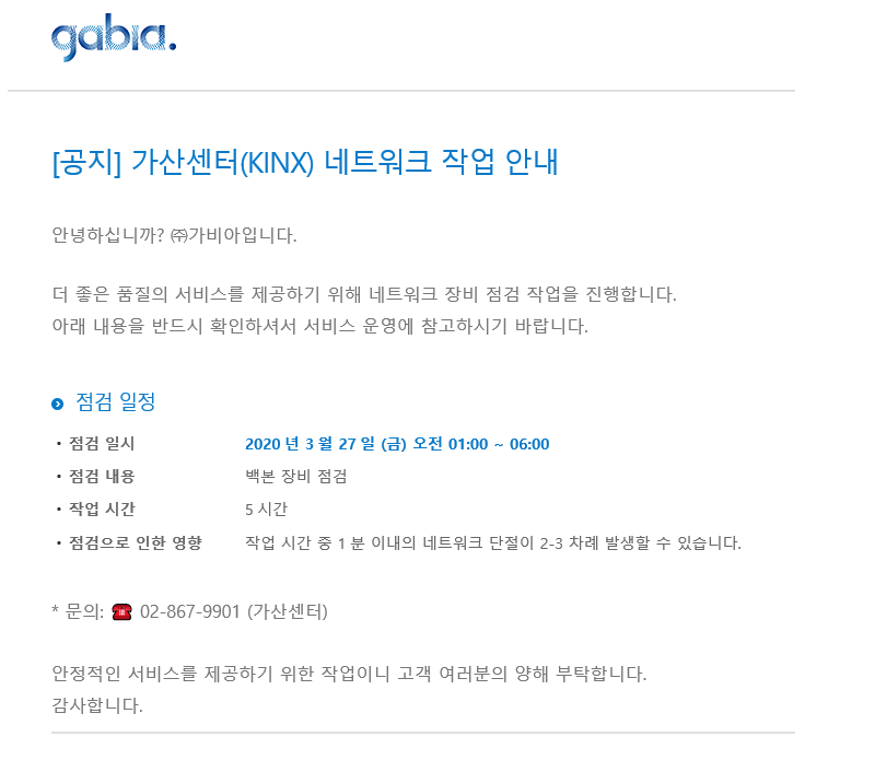2020년 3월 27일 (금) 오전 01:00 ~ 06:00 네트워크 장비 점검 작업이 진행되어 안내 드립니다.