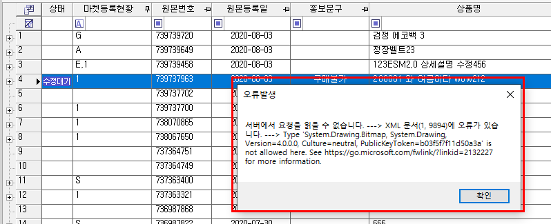 *실패사유 : 서버에서 요청을 읽을 수 없습니다. ---> XML 문서(1, 9894)에 오류가 있습니다. ---> Type 'System.Drawing.Bitmap, System.Drawing, Version=4.0.0.0, Culture=neutral, PublicKeyToken=b03f5f7f11d50a3a' is not allowed here. See