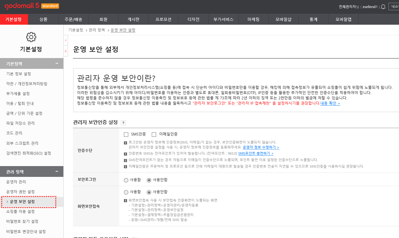 2. 기본설정>관리정책>운영보안설정 메뉴를 클릭합니다.