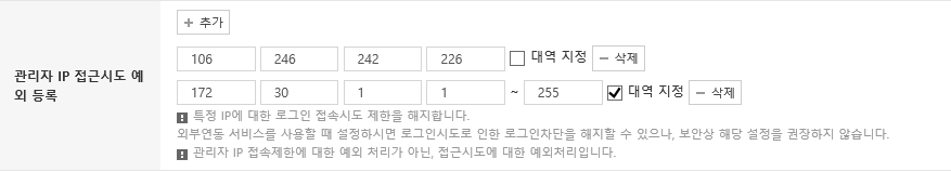 [관리자 IP 접근시도 예외 등록] 항목에 사용하시는 PC의 IP정보를 입력합니다.