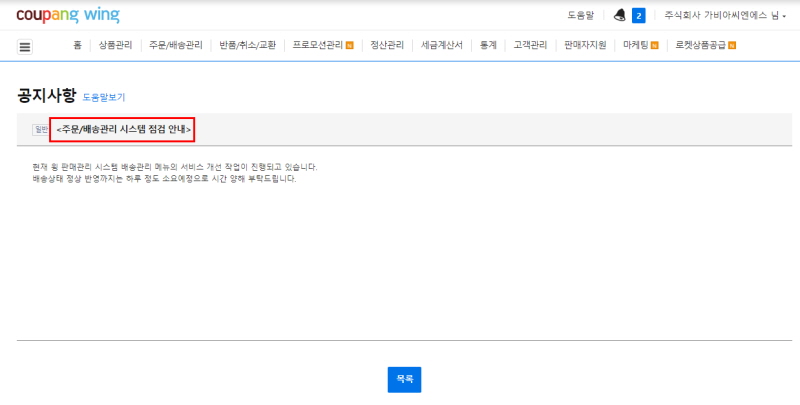 현재 쿠팡 wing 판매자 센터 점검 진행으로 인해 주문 수집 실패되어 안내 드립니다.