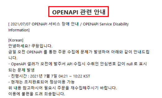 쿠팡 주문 수집이 실패되고 있어 안내 드립니다.