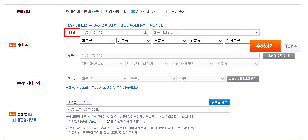 * 현재 ESM 마스터 카테고리가 필수로 변경되지 않아 설정 없이 등록 및 수정 가능합니다.