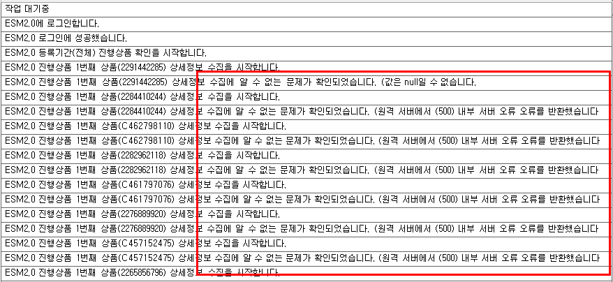 - 상세정보 수집에 알 수 없는 문제가 확인되었습니다. (원격 서버에서 (500) 내부 서버 오류 오류를 반환했습니다.) 해당 상품 제외 후 수집합니다.